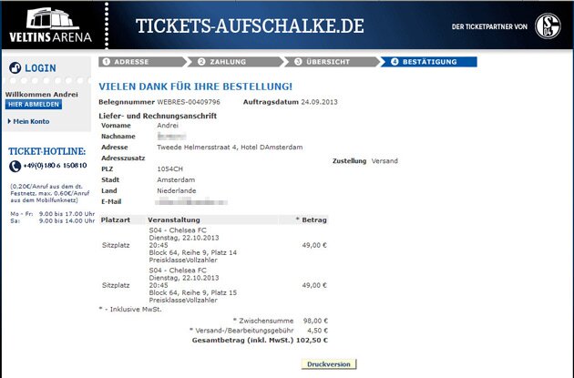 Я решил не ждать 24 числа и попробовать выиграть какой-нибудь аукцион. Как и в случае с билетами на Баварию, я списался с продавцом понравившегося мне лота и спросил по поводу отправки билетов в Амстердам, на что получил вполне внятный ответ "Das ist kein Problem !!" Кстати, по поводу лота. Билеты продавались на "S?dkurve" (южную трибуну за воротами) в сектор 69, в так называемый Familienblock (или Volkswagenblock), состоящий из секторов 68-70. Familienblock - это семейных блок. Билеты для детей в этом блоке вдвое дешевле. Но продавец честно указал - Beide Karten sind Vollzahlerkarten. Это означает, что билеты у него "взрослые", за полную стоимость. Это, кстати, важно - обращайте внимание, чтобы не пришлось дяденьке под 40 изображать из себя 14 летнего подростка.