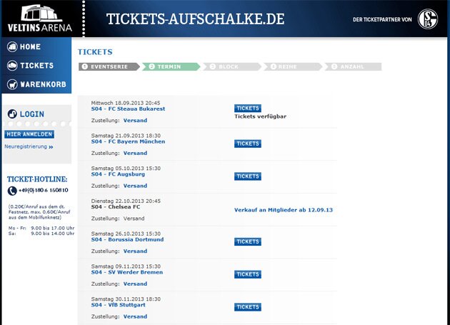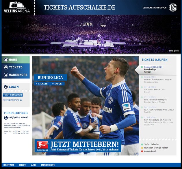 В разделе Tickets мы находим ссылку Ticketshop, которая перебрасывает нас на сайт Фелтинс-Арены www.tickets-aufschalke.de