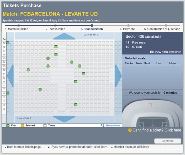 Я не ожидал, что звонок раздастся так скоро. Ровно через сутки, 23 июля в 12:05 я услышал гимн Барселона в телефонной трубке снова. Я стрелой помчался на сайт, где увидел план стадиона с секторами. При наведении мышки на конкретный сектор, на сайте отображалось количество доступных мест и фотография, сделанная из этого сектора для оценки обзора. Нужно было спешить. Ведь мест рядом было очень немного. Примерно одна пара в каждом втором секторе. А мне обязательно нужны были два билета рядом! На оформление покупки дается всего 10 минут.